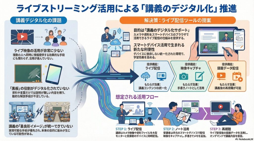 この「ライブ配信ツール」の活用方法は、講義や授業の「ライブ配信」から、「講義コンテンツの統一化」「スマートデバイスのノート化」「配信映像の再視聴」などの体験を行うことで、「講義のデジタル化」を「システム検討」する検証支援に活用できると考えています。