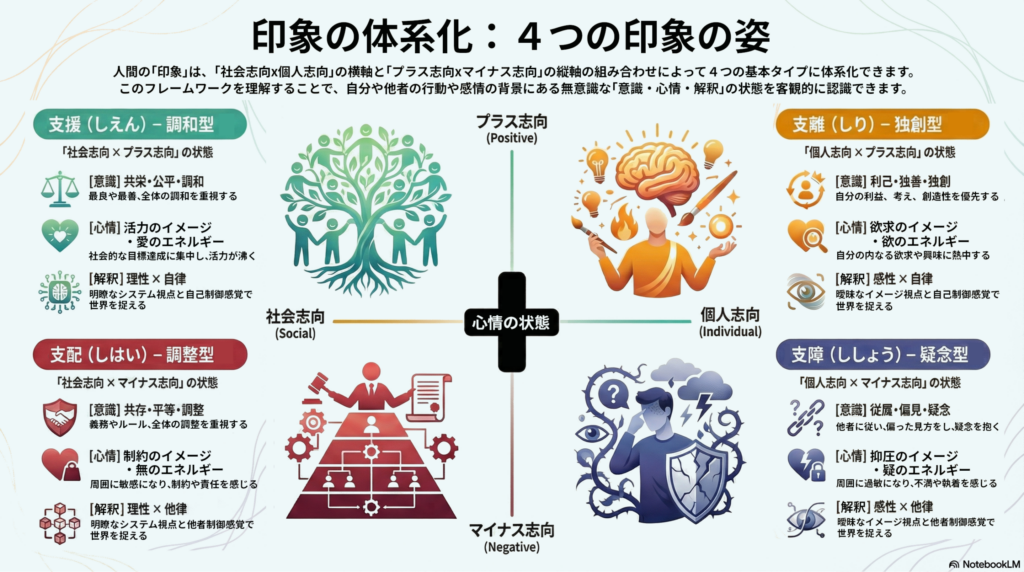 以上より、印象の「支離、支障、支援、支配」を理解できると、自分の客観的な「意識、心情、真実」の状態