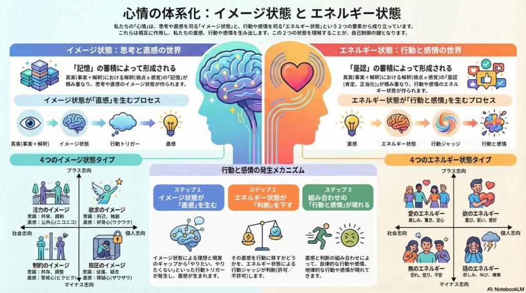 心情の状態を構成する「イメージ状態、エネルギー状態」のバランスで「行動や感情」が生まれる