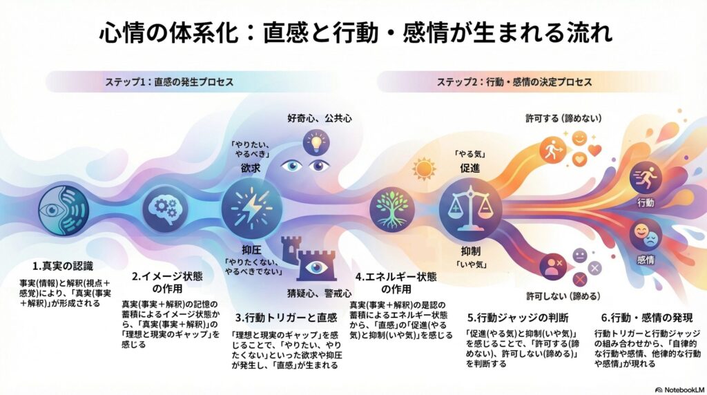 その流れは、「イメージ状態」から「行動トリガー」が発生し「直感」が生まれ、「エネルギー状態」から「行