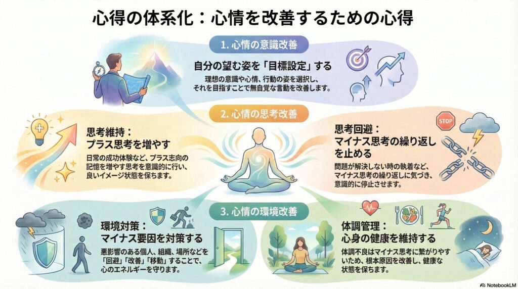 この体系化は、「心得(意識、思考、環境、体調)」の「手法(スキル)」の定義です