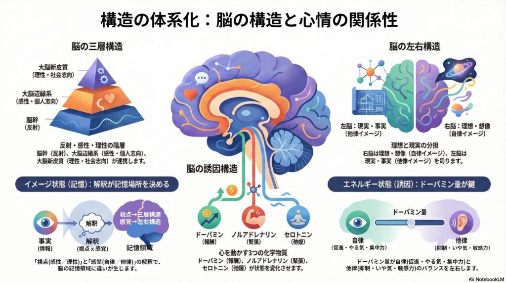 脳幹:[反射]、大脳辺縁系:[感性、個人志向]、大脳新皮質:[理性、社会志向]